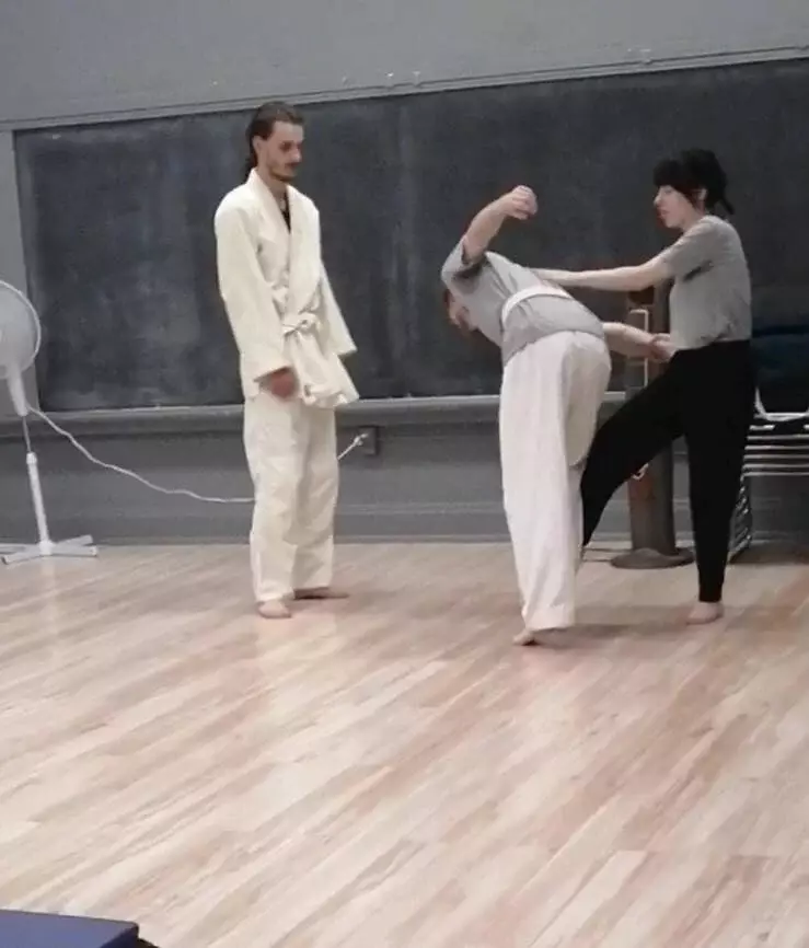 We bow in and stretch out. The air fills with the sound of limbs striking pads, there's laughter, more striking. Time to switch up. Now someone's being thrown. Laughter erupts from another pair. The evening slyly slips by.
